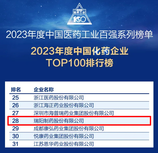公司榮登2023年度 中國化藥企業百強榜第28位